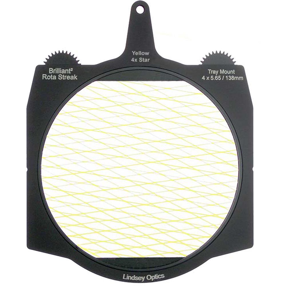 This yellow 4-point star Brilliant² 4 x 5.65" Rota-Streak Filter from Lindsey Optics is a 138mm glass filter in a frame made to fit 4 x 5.65" matte boxes. The filter can be rotated manually or by using a motor to position the filter effect in any desired position. It adds an in-camera star effect on bright lights and highlights in a scene.