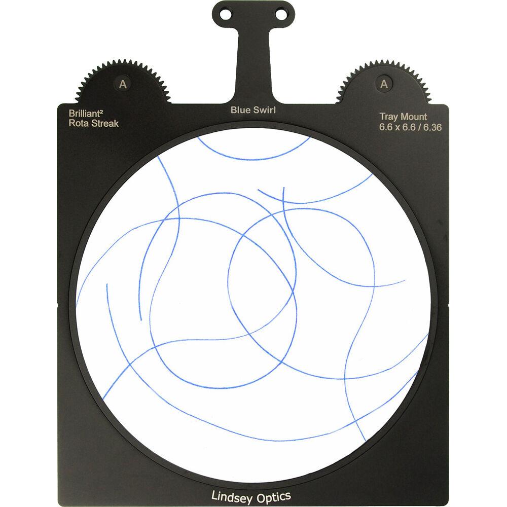 This Brilliant² Rota-Streak Filter from Lindsey Optics is a glass filter in a frame made to fit most standard 6.6 x 6.6" matte boxes. The filter has embedded blue curved rods in a random pattern to create a swirl streak effect on bright lights and highlights in the shot. The filter frame features two gears, one on each side of the tray, for flexibility in rotating the filter from either side of the lens. Rotate the filter manually or use a motor to orient the filter's effect in your desired position.