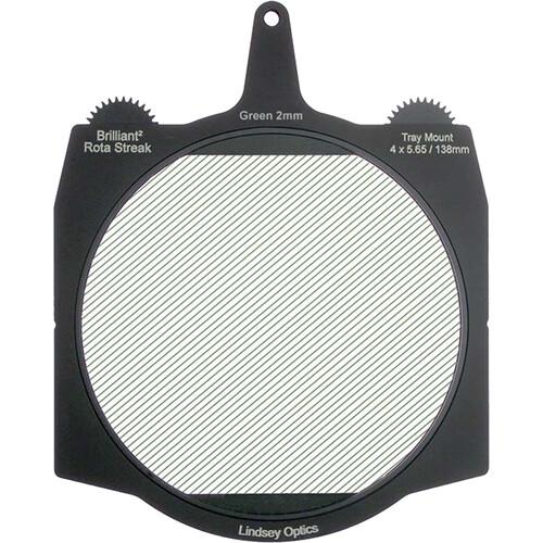 This Brilliant² Rota-Streak Filter from Lindsey Optics adds a green-tinged, two-point streak effect on bright lights and highlights in the shot. Its frame is compatible with most 6.6 x 6.6" matte boxes and features two gears, one on each side of the tray, for flexibility in rotating the filter from either side of the lens. Rotate the filter manually or use a motor to orient the filter's effect in your desired position.