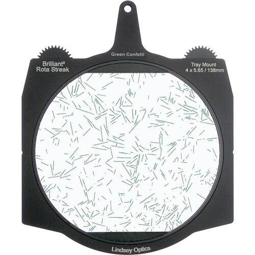 This Brilliant² Rota-Streak Filter from Lindsey Optics is a glass filter in a frame made to fit most standard 6.6 x 6.6" matte boxes. The filter has embedded green rods in a random pattern to create a confetti streak effect on bright lights and highlights in the shot. The filter frame features two gears, one on each side of the tray, for flexibility in rotating the filter from either side of the lens. Rotate the filter either manually or by using a motor to orient the filter's effect in any desired position.
