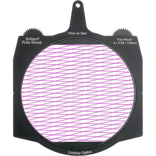 This Brilliant² Rota-Streak Filter from Lindsey Optics is a glass filter in a frame made to fit most standard 6.6 x 6.6" matte boxes. The filter has embedded pink rods in a fixed pattern to create a star streak effect on bright lights and highlights in the shot. The filter frame features two gears, one on each side of the tray, for flexibility in rotating the filter from either side of the lens. Rotate the filter either manually or by using a motor to orient the filter's effect in any desired position.