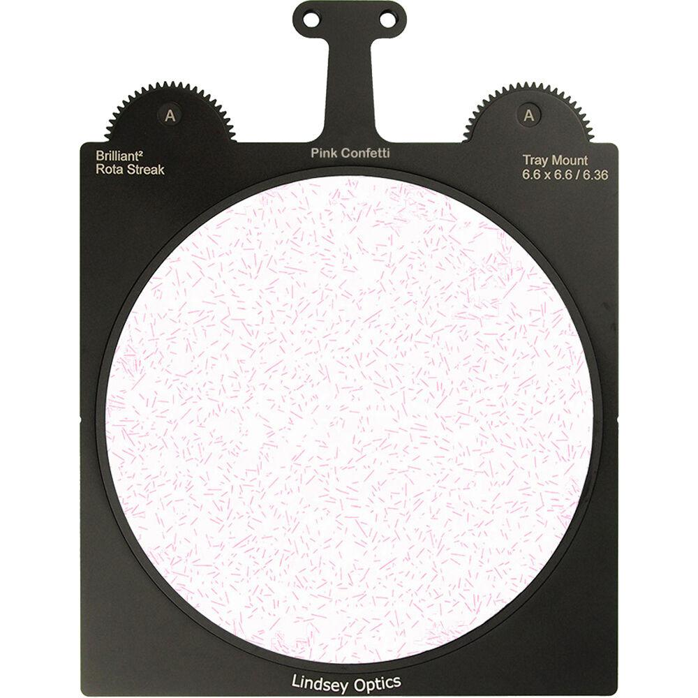 This Brilliant² Rota-Streak Filter from Lindsey Optics is a glass filter in a frame made to fit most standard 6.6 x 6.6" matte boxes. The filter has embedded pink rods in a random pattern to create a confetti streak effect on bright lights and highlights in the shot. The filter frame features two gears, one on each side of the tray, for flexibility in rotating the filter from either side of the lens. Rotate the filter either manually or by using a motor to orient the filter's effect in any desired position.