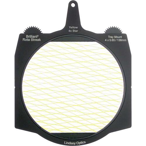 This Brilliant² Rota-Streak Filter from Lindsey Optics is a glass filter in a frame made to fit most standard 6.6 x 6.6" matte boxes. The filter has embedded yellow rods in a fixed pattern to create a star streak effect on bright lights and highlights in the shot. The filter frame features two gears, one on each side of the tray, for flexibility in rotating the filter from either side of the lens. Rotate the filter either manually or by using a motor to orient the filter's effect in any desired position.