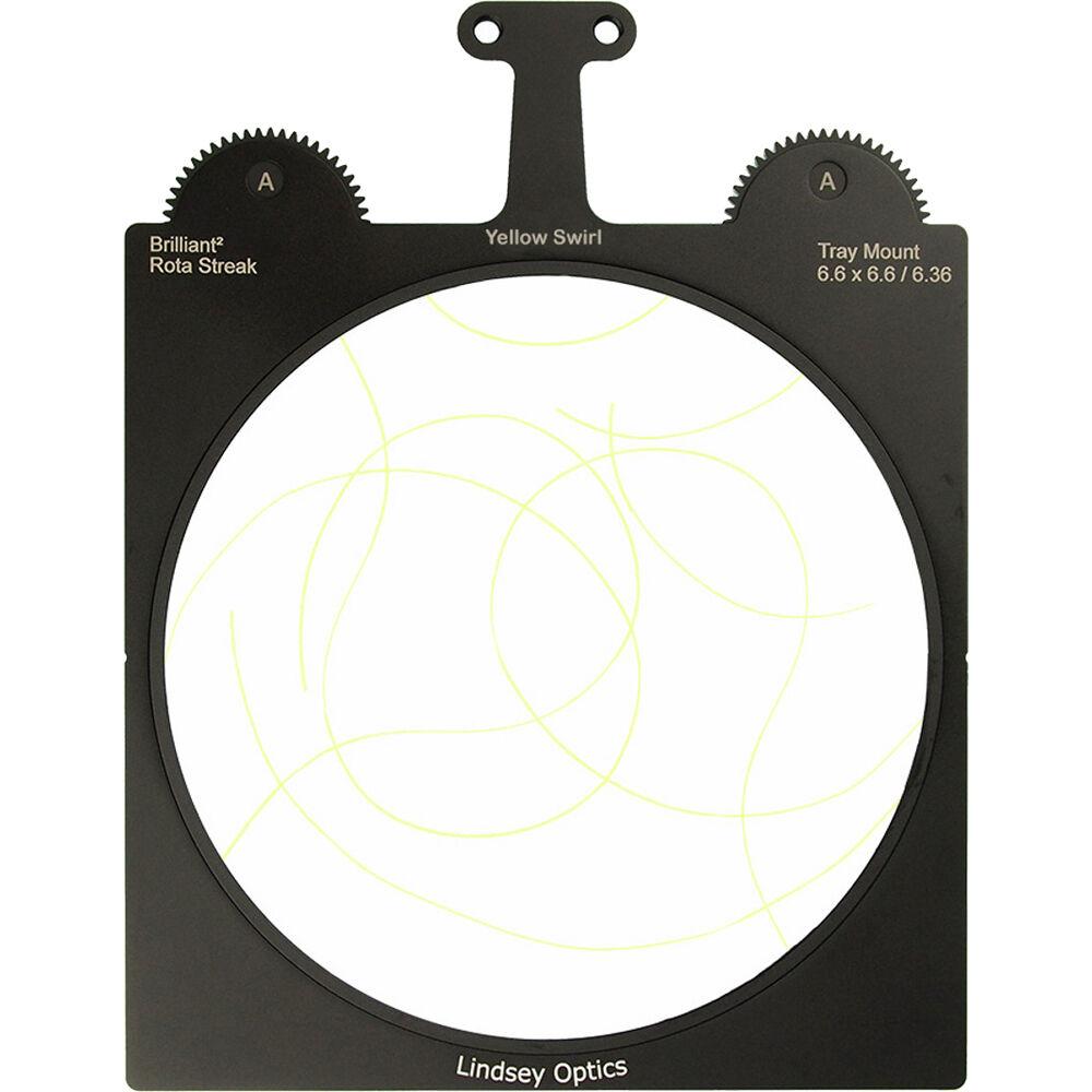 This Brilliant² Rota-Streak Filter from Lindsey Optics is a glass filter in a frame made to fit most standard 6.6 x 6.6" matte boxes. The filter has embedded yellow curved rods in a random pattern to create a swirl streak effect on bright lights and highlights in the shot. The filter frame features two gears, one on each side of the tray, for flexibility in rotating the filter from either side of the lens. Rotate the filter either manually or by using a motor to orient the filter's effect in any desired position.