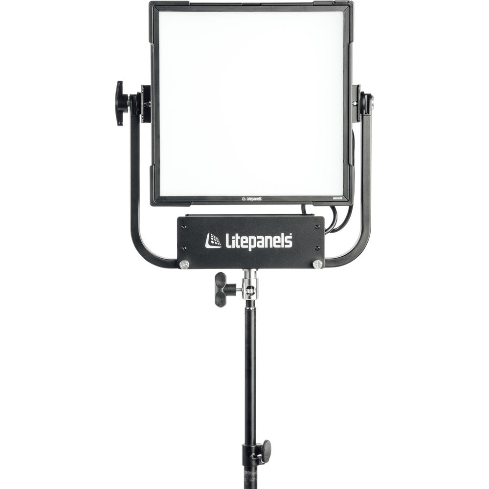 Stability, rugged construction, flexibility, and control are hallmarks of the LitePanels Gemini 1x1 Soft RGB LED Light Panel with Pole-Operated Yoke and UK Power Cord. The aluminum-constructed, 12.6 x 12.6 x 4.6" RGBWW fixture has multiple lighting modes including CCT, Hue, Saturation, Gel Presets, as well as an effects mode. The CCT color temperature control has six factory presets in increments from 2700 to 10,000K. There are also six presets for user-defined color temperature and plus/minus green control. The HSI Color mode allows you to adjust the hue, saturation, and intensity, while Gel mode permits your choice from a library of filters favored by filmmakers, and an effects mode provides nine different effects to work with. The light has a CRI/TLCI rating of 97 for daylight balance and 94 for tungsten balance, indicating an accurate rendition of color. The Gemini is dimmable from 100 to 0.1% without flicker or color shift, and settings and features are displayed on the rear LCD screen.
