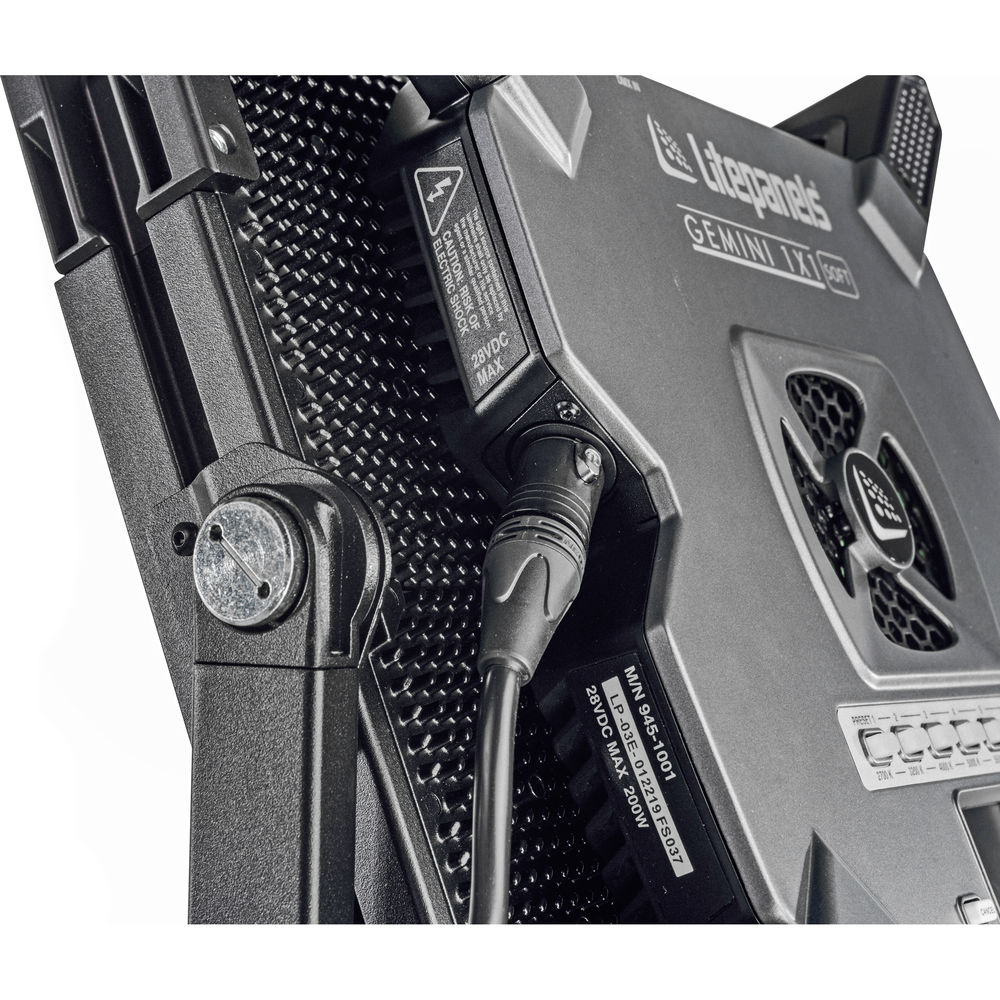 Stability, rugged construction, flexibility, and control are hallmarks of the LitePanels Gemini 1x1 Soft RGB LED Light Panel with Standard Yoke and UK Power Cord. The aluminum-constructed, 12.6 x 12.6 x 4.6" RGBWW fixture has multiple lighting modes including CCT, Hue, Saturation, Gel Presets, as well as an effects mode. The CCT color temperature control has six factory presets in increments from 2700 to 10,000K. There are also six presets for user-defined color temperature and plus/minus green control. The HSI Color mode allows you to adjust the hue, saturation, and intensity, while Gel mode permits your choice from a library of filters favored by filmmakers, and an effects mode provides nine different effects to work with. The light has a CRI/TLCI rating of 97 for daylight balance and 94 for tungsten balance, indicating an accurate rendition of color. The Gemini is dimmable from 100 to 0.1% without flicker or color shift, and settings and features are displayed on the rear LCD screen.