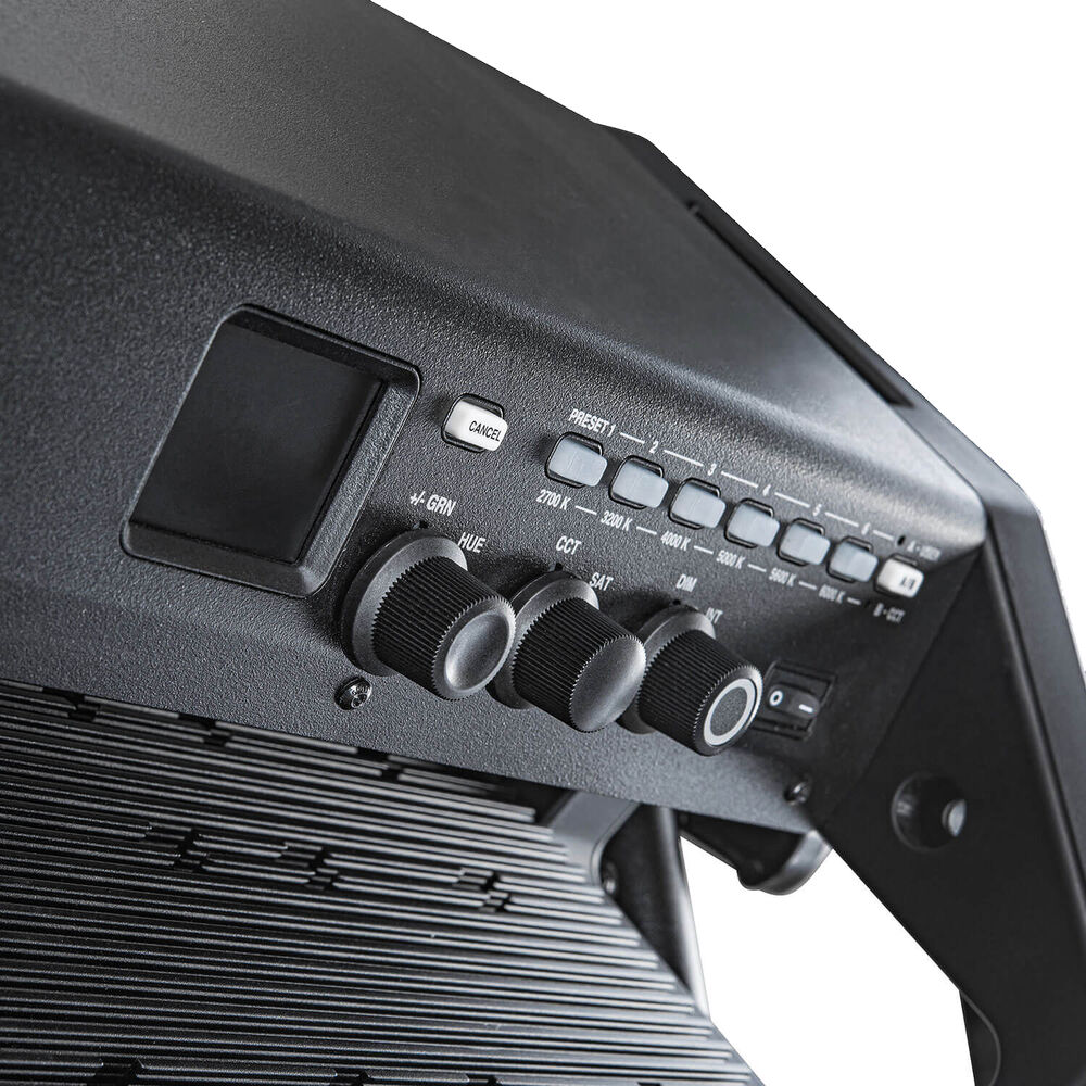 Providing high-quality cinematic lighting features in a lightweight and easy-to-use fixture, this Gemini 2x1 Hard RGB LED Panel from Litepanels offers a high light output of 23,000 lux at 9.8' with a color temperature range of 2700 to 10,000K, enabling this panel to accurately match both tungsten and daylight light sources. The 0 to 100% flicker-free dimming lets you adjust the light output, and full plus/minus green color correction control and a high CRI of 95 ensure color accuracy. Full RGBWW color gamut mixing and a built-in HSI color mode enable full-color control over hue, saturation, and intensity. The panel provides a gel mode with up to 300 different colored gels to choose from, and an effects mode with 11 unique special effects. All of these adjustments can be made locally on the unit or remotely via a console, and there's even the option of wireless operation via DMX, RDM, and CRMX protocols.