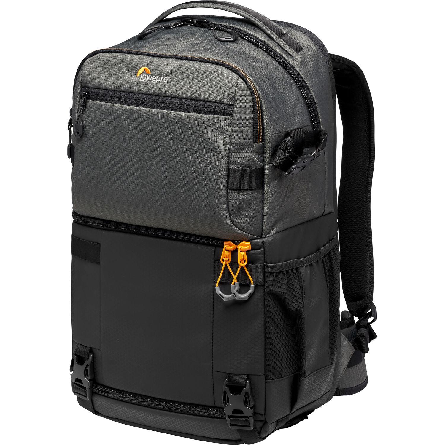 The gray Fastpack Pro BP 250 AW III from Lowepro is a versatile backpack that features two main compartments, including a camera compartment along the base of the bag that can be used to hold a DSLR or mirrorless camera body with four or five lenses, including an attached 24-70mm f/2.8 lens. Positioned so that it can be reached when the bag is rotated from one's back to front with its left side facing upward, the camera compartment's zippered, peel-away opening includes an internal clip system that allows the wearer to ensure that the zippered opening provides side access only. Alternatively, the clip system can be released so that the peel-away opening can be fully unzipped and retracted, enabling complete access to the camera compartment such as when the bag is placed on a flat surface with its backpack straps facing downward. Above the camera compartment, a top-facing zippered storage compartment can accommodate packable clothing and features organizer pockets which can be used to store travel documents, camera batteries, memory cards, or small electronics.