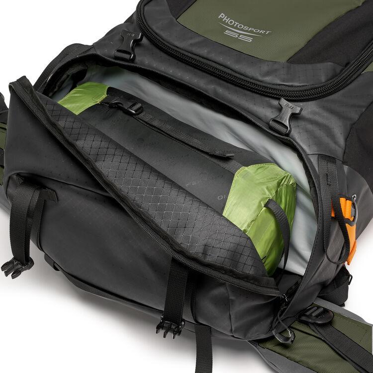 The 55L PhotoSport PRO BP AW IV accommodates a full frame mirrorless or DSLR with a portrait grip and an attached lens up to 70-200 f/2.8, or a small drone like the Mavic Pro 2. Included with the pack is a GearUp PRO XL camera insert to organize the interior and protect your gear. The insert has adjustable dividers that can be customized to suit your equipment needs. A spacious top-loading compartment holds personal items including clothes and other travel or camping essentials. The pack has a dedicated sleeping bag compartment on the bottom. The ActivLift torso length adjustment system covers a range from 14-19". The small-medium straps fit smaller torsos and have a slight curve with foam that is strategically perforated for flexibility.