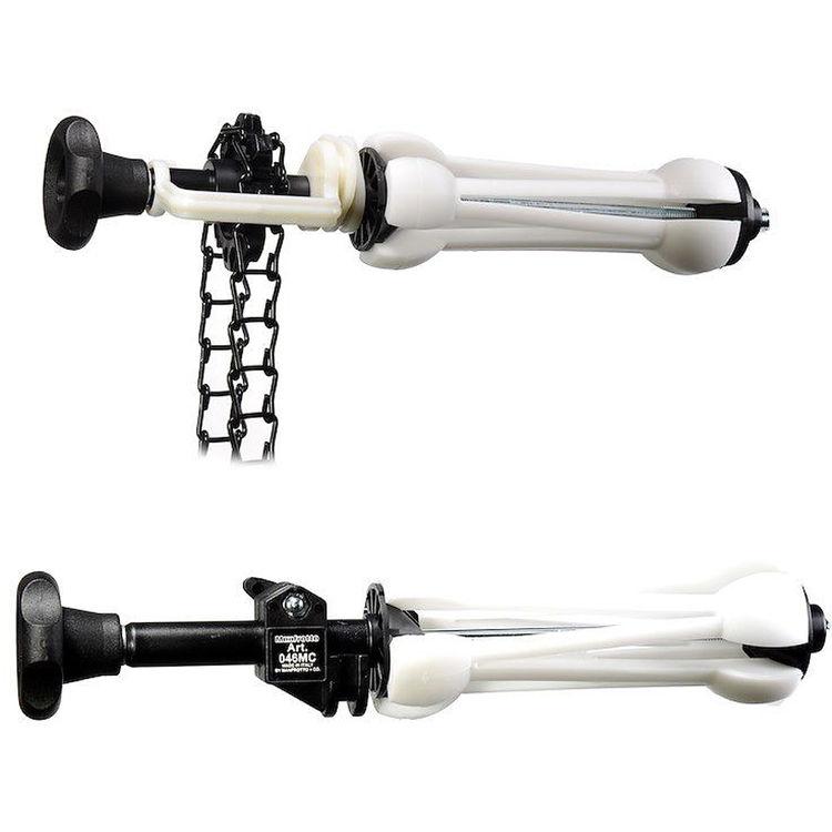 The Manfrotto 046MCB Expan Drive Set with Black Metal Chain allows easy raising and lowering of rolls of background paper without lowering the support stands. The system uses two expandable technopolymer inserts to support a single roll of seamless paper. Tightening each side expands the drive inserts from 1.8" to 3" to grip the roll solidly from the inside. One side has a large toothed gear to which a metal link chain affixes, permitting convenient raising and lowering of the background paper roll. The other side has an adjustable tension drag.