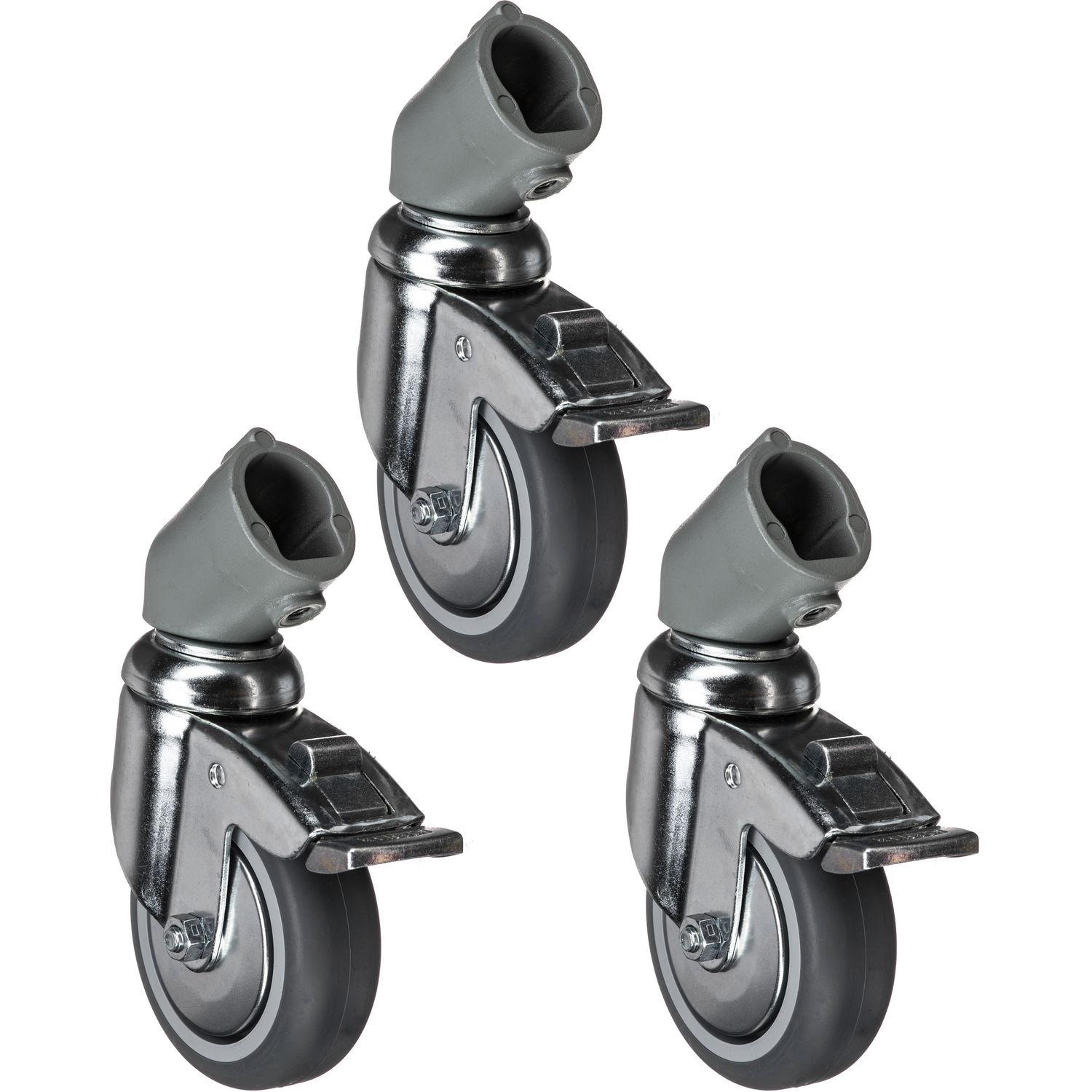 The Manfrotto 110 Braked Caster Set is a set of 3 75mm diameter braked wheels with adapter for any light stand legs that are 22mm in diameter. They slip onto the leg ends, and are locked in place using a hex wrench.