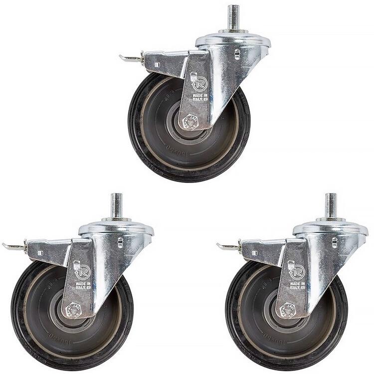 This Manfrotto 374-10 Braked Wheel Set is a set of 3 braked wheels that are 6.3" (160mm) in diameter. Designed to be used in extreme conditions of overload. These wheels, having a wide tread, sink into soft ground much less than any other model. Attaches to the Manfroto Wind Up Stand via its M10 thread.