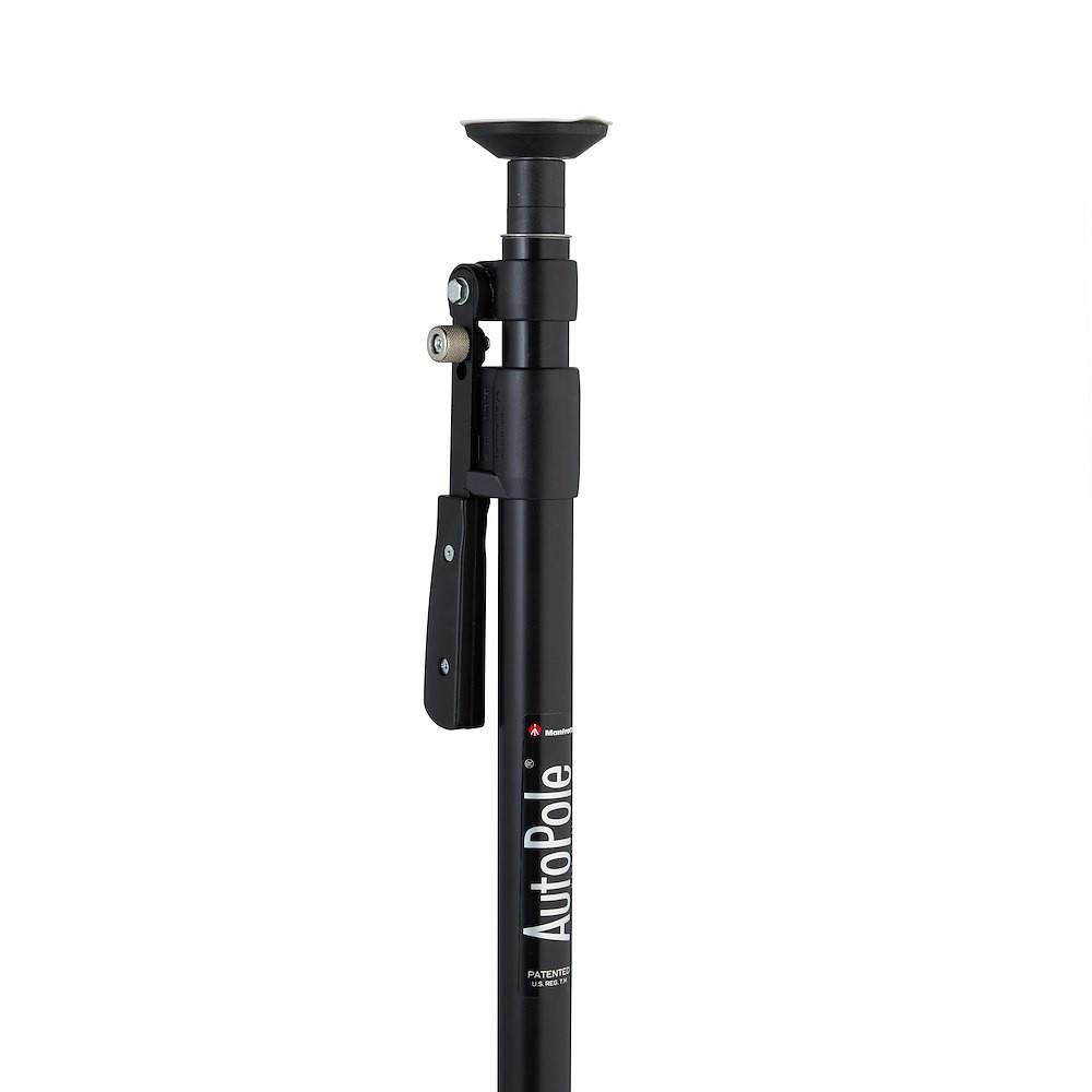 The 432-2.7B Short Deluxe Autopole 2 from Manfrotto, with a black aluminum finish, mounts between the floor and ceiling of a studio with a larger, stronger spring-lock handle than a standard Autopole. If the studio ceiling is higher than 8.8', then Autopole bases, extensions, or the standard-sized Autopole 2 may be ordered separately.