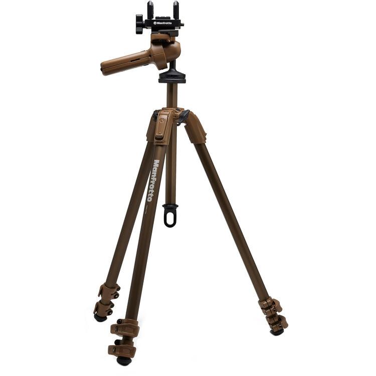 The Alpha S.H.O.T. Grip Tripod Kit from Manfrotto offers a lightweight but stable support for hunting and shooting, with sturdy three-piece 190-series aluminum legs and a ball head with trigger grip for effortless aiming of your rifle or optics. Squeeze the trigger to adjust your aim and release it to lock into position. The Grip Tripod Kit is set up for left-handed users, but can easily be configured for right-handed use. The quick detach mechanism makes it easy to swap a rifle with an optic. The tripod features an independent center column for quick height adjustments with a counterweight hook at the bottom. Rubber and spike feet provide options for getting the best grip on the terrain.
