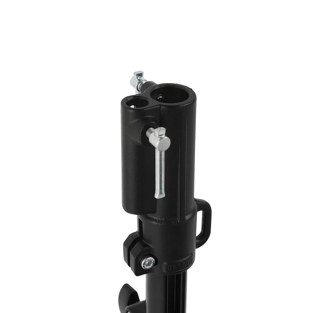 The 9' Manfrotto Short Wind-Up Stand is a black steel stand with geared column and one leveling leg. Rugged and heavy duty. It combines the strength, stability and portability that is required by today's demanding professionals. Like all Manfrotto Cine Style stands, it features Universal Mounts which have both a 1-1/8" and 5/8" female socket as well as a 5/8" male stud.