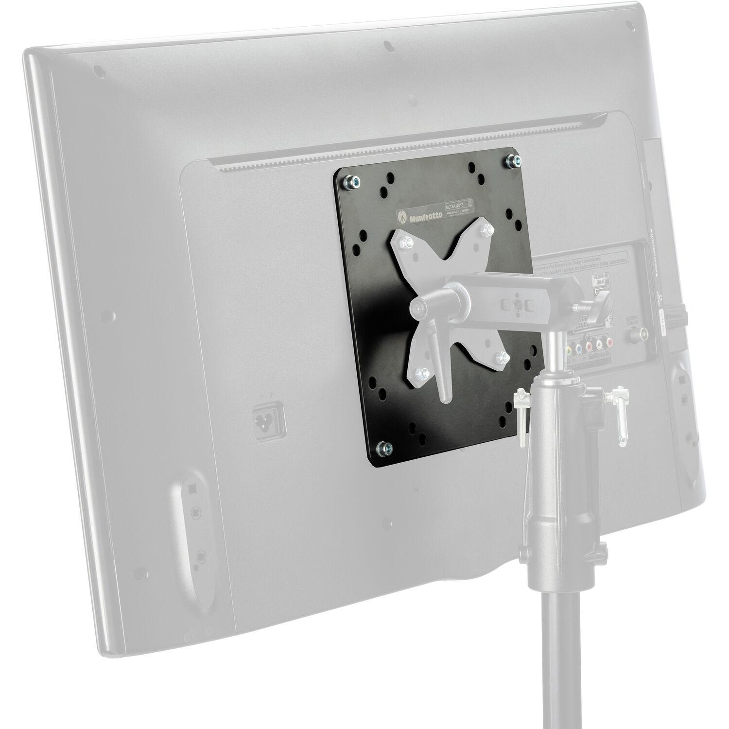Mount a larger, heavier monitor weighing up to 66 lb when using the TetherGear VESA Monitor Mount in your video village with this TetherGear VESA Adapter Plate from Manfrotto. The durable steel mounting plate attaches to the back of the monitor, providing a solid support for large monitors. The plate supports 120 x 180mm, 180 x 120mm, 200 x 100mm, and 200 x 200mm VESA patterns. Mounting hardware is included with the plate.