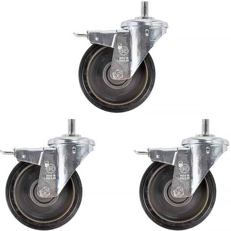 The 8" Wheel Set with Brakes from Manfrotto, in a set of three, fits the 12.6' Avenger Super Wind-Up 40 and the 9.5' Super Wind-Up 29 light stands. The wheels make it easy to move heavy loads, especially at maximum extension, while the brakes prevent accidental movement.