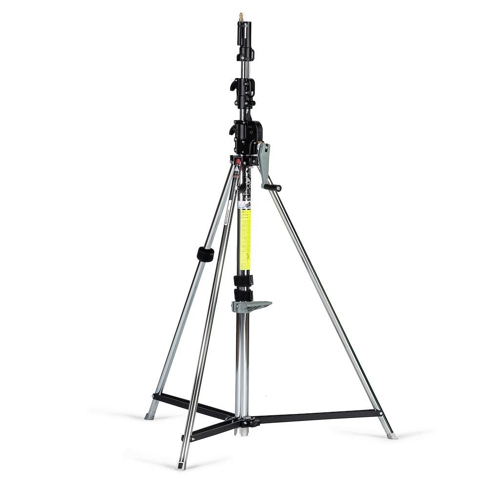 The Manfrotto Wind-Up Stand is a 12' tall chrome-plated steel stand with geared column and one leveling leg. Rugged and heavy duty, it combines the strength, stability and portability that is required by today's demanding professionals. Like all Bogen cine-style stands, it features a Universal Mount which has both a 1-1/8" Junior and 5/8" Baby receiver as well as a 5/8" stud.