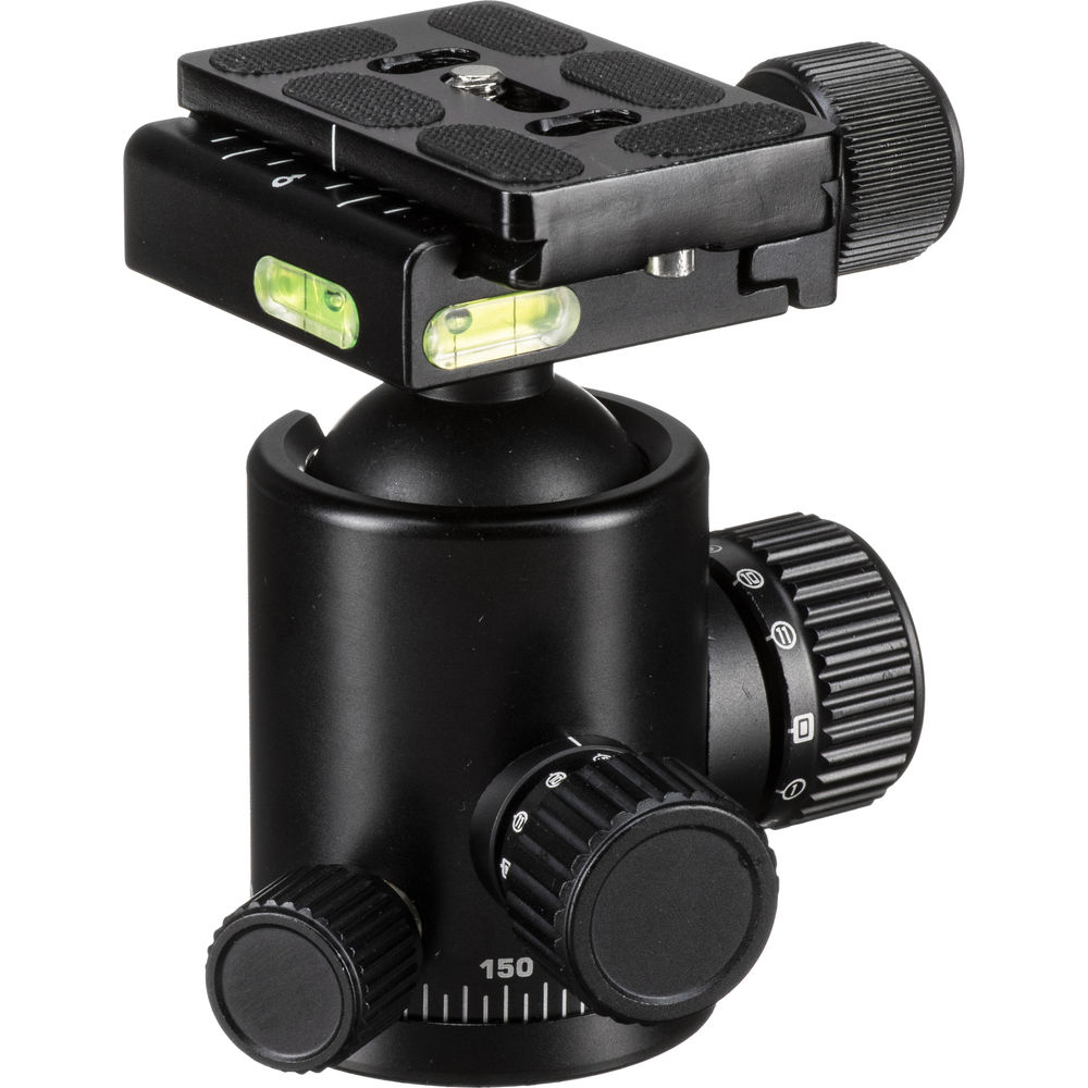This ball head will support loads up to 26.4 lb and it features a bubble level. It is supplied with a precision-machined Arca-type quick release plate that is well-balanced and allows quick, safe, and positive-locking of the camera. The mounting plate can stay permanently attached to the camera to avoid taking the time to screw the camera onto the ball or screwing the ball onto the camera.
