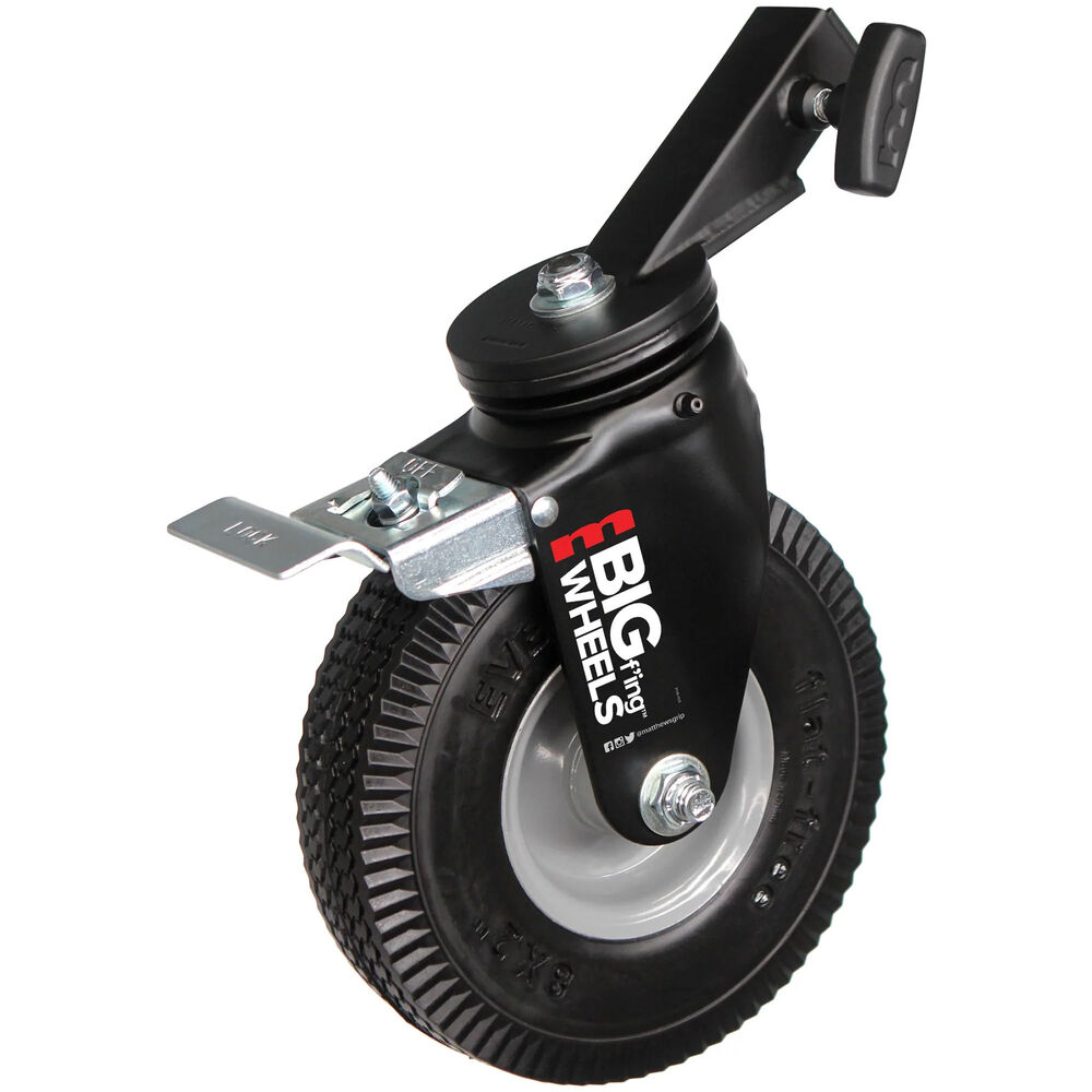 The tires install quickly and secure to the stand's legs via steel spring retainers. The wheels are 8" in diameter and 2" thick, and they swivel and roll easily over different types of terrain. The top brake above each wheel locks both the swivel and roll easily and hassle-free.
