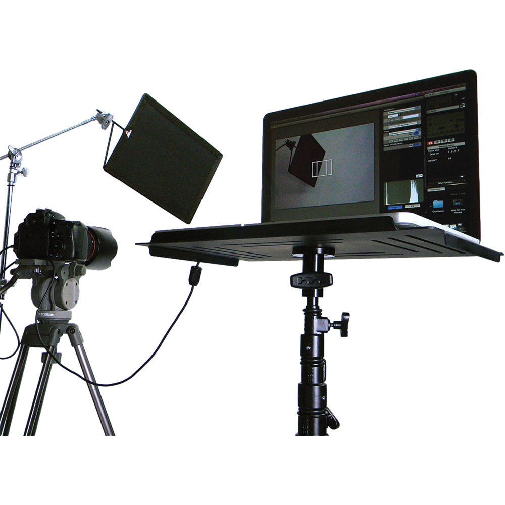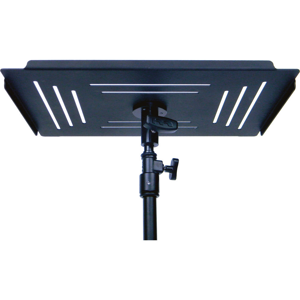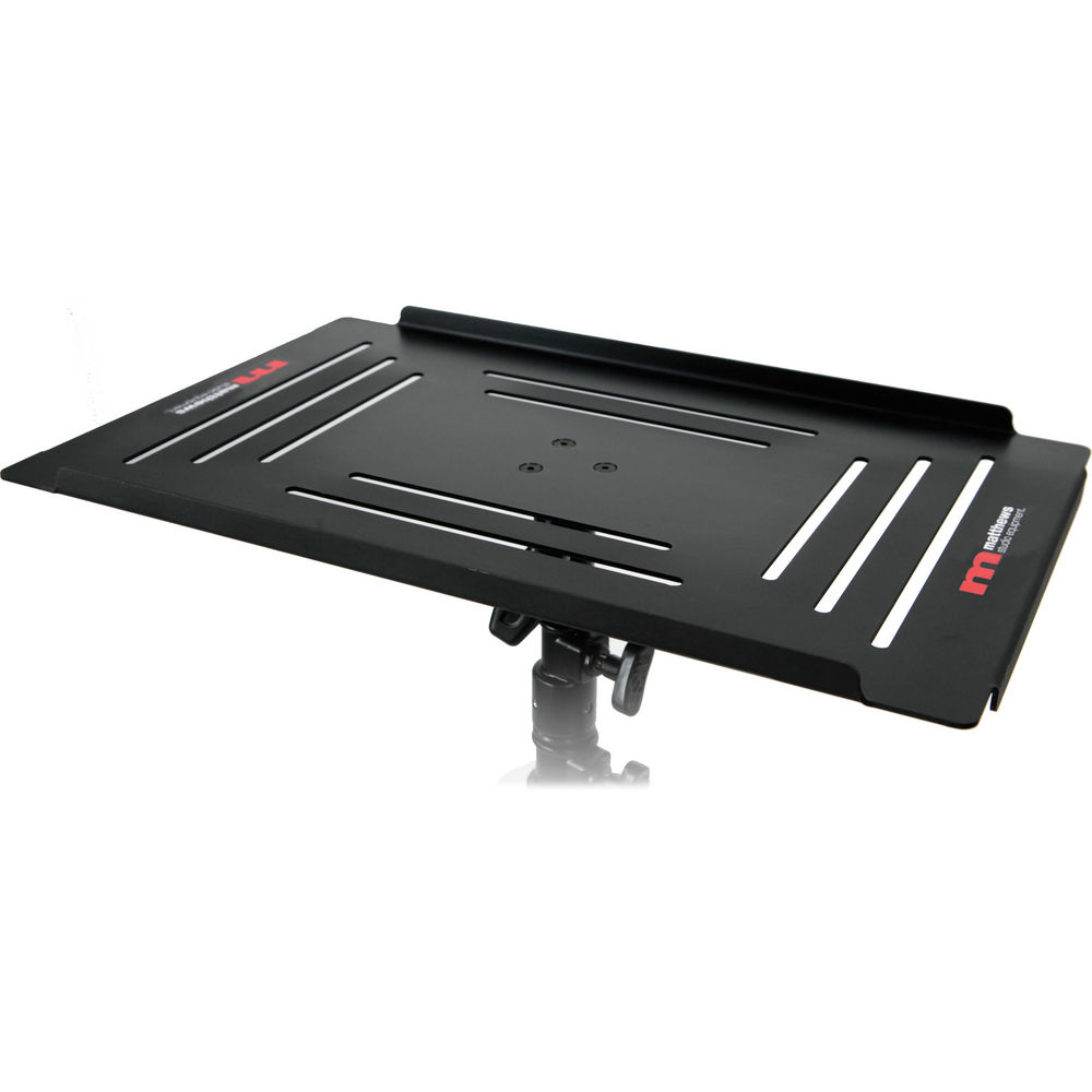 The Digital Imaging Technician Kit from Matthews is a lightweight (1.8 lb) tray that can hold a laptop which falls within the dimensions 10.5 x 16.5". It has slots to increase airflow and reduce overheating. A 3/8"-16 threaded mounting hole on the bottom of the tray allows it to be mounted to tripods or other supports with a 3/8"-16 stud. A 5/8" adapter is included so you can mount the tray to light stands as well. Also included is a case to protect your tray during transport.