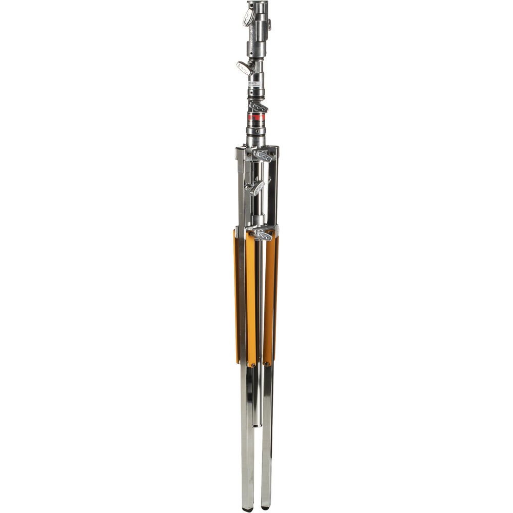 The Hollywood Combo Stand is a durable, time-tested solution for rigging lighting fixtures of significant weight. Lights equipped with junior pins slot directly into the top of the stand, which is rated with a maximum weight capacity of 90 lb. A spring-loaded 5/8" baby pin instantly pops up to transform the Hollywood Combo Stand into a heavy-duty support platform for smaller light fixtures. These units can reach heights up to 11.3', a range inaccessible by C-stands. One can also insert a 4-1/2" "lollipop" grip head into the junior receiver to set high-flying flags or start off a quick goal-post style rig (available separately).