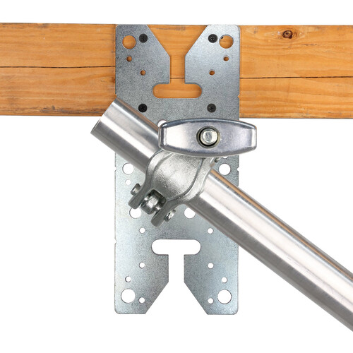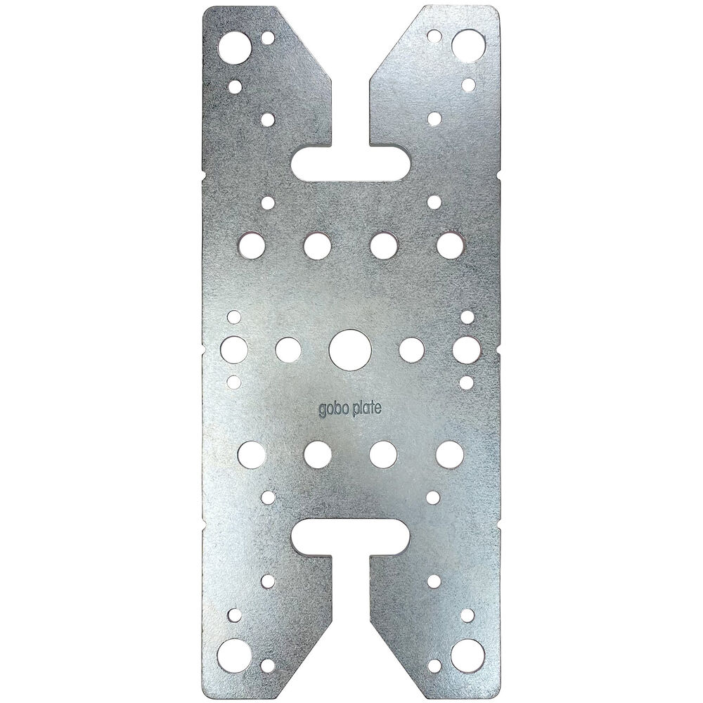 Featuring heavy-duty 9-gauge thick steel construction, the Gobo Plate XL from Matthews is designed to prevent a 4.5" grip head from being dismounted when loosening it for adjustments. The plate has cutouts to accommodate two grip heads, a 5/8" hole for Baby pins or rods, and six evenly spaced markers on the edges for positioning at a 45-degree angle without measuring it out. Matthews provides multiple ways to mount the plate. There are four 1/2" diameter holes, twelve 3/8" bolt holes, and twenty screw or nail holes.