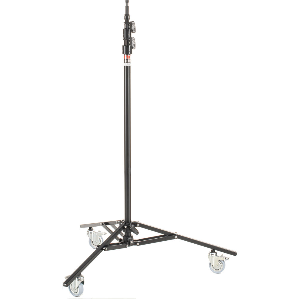 The 3-section, black-finished Matthews Hollywood Baby Junior Double Riser Stand has a wide 42" footprint and long legs for maximum stability. It rises to a maximum height of 9.6' and can support heavy gear weighing up to 30 lb. The Baby Junior Double Riser has locking, non-marking casters for easy repositioning, even at maximum height. The stand is topped by a 5/8" pin for lights and accessories with a matching receiver.