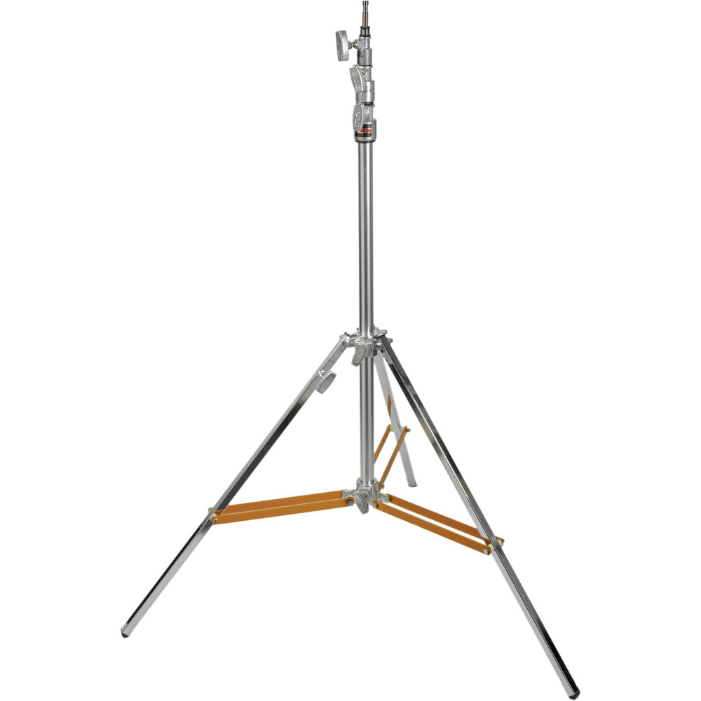 The steel-constructed, silver-finished Hollywood Beefy Baby Triple Riser Stand with Rocky Mountain Leg from Matthews has a triple riser that extends to 12.3', a stable footprint of 35.5', can support gear weighing up to 20 lb, and has a welded 5/8" Baby pin. One of the stand's special features is its leveling leg, called "Rocky Mountain Leg" by Matthews, which extends independently of the others to center the weight and provide stability on uneven surfaces.