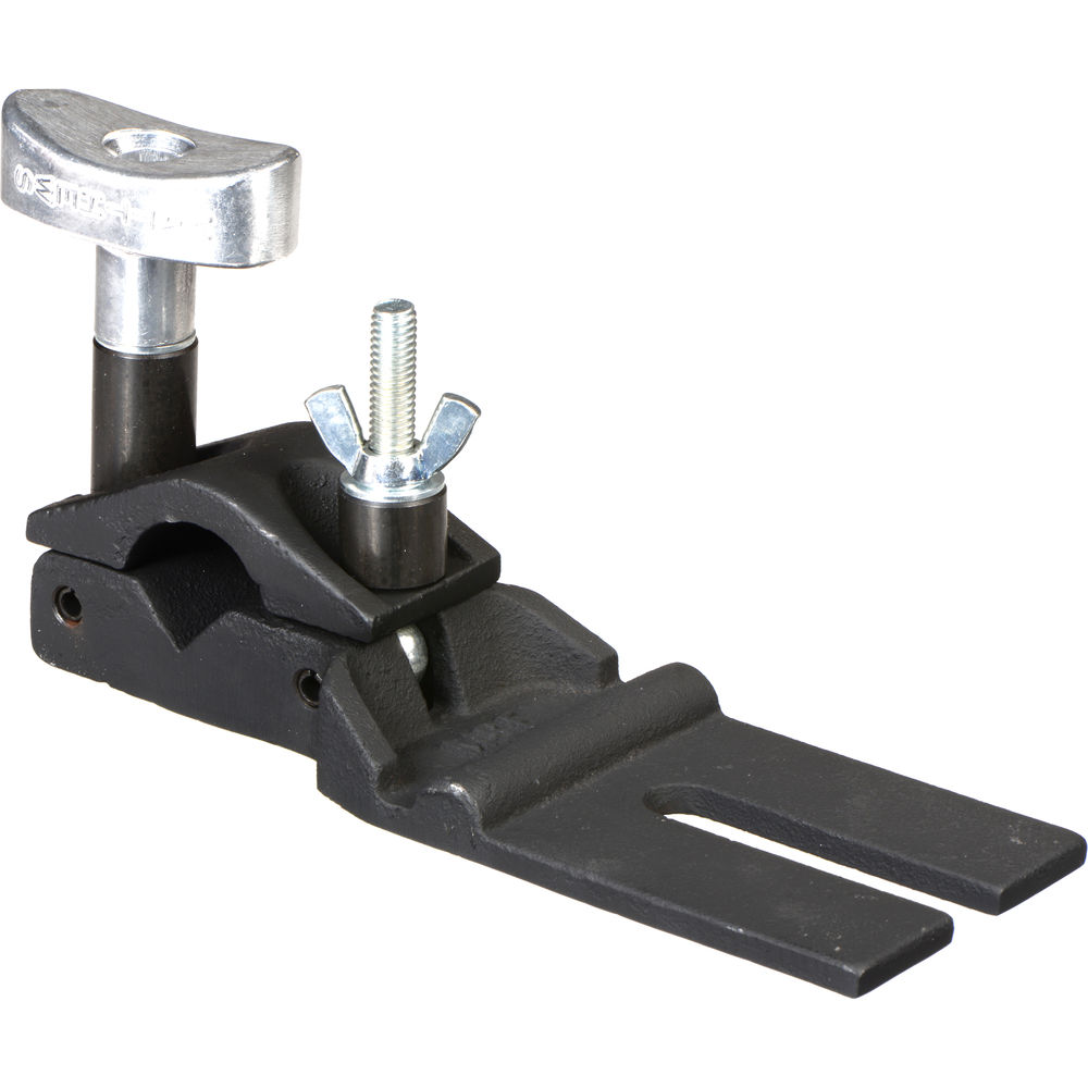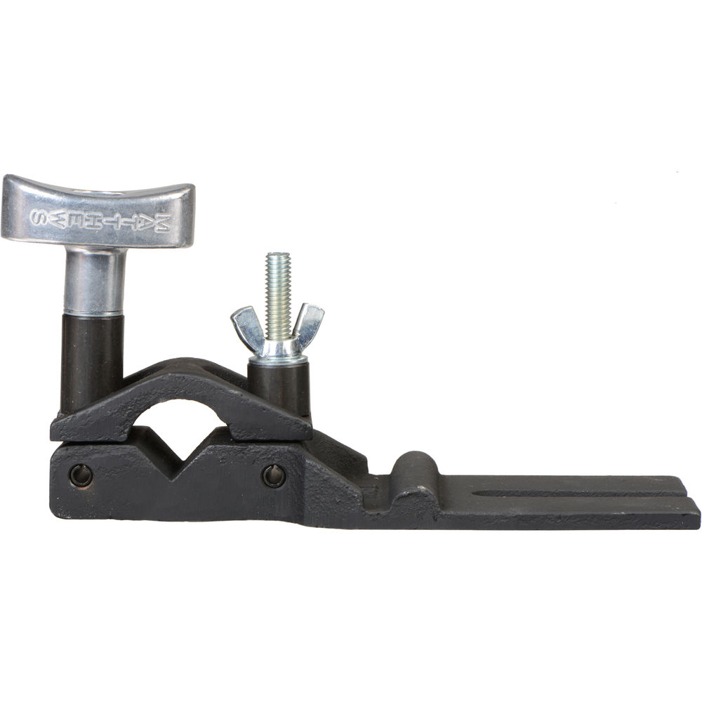 Gusseted for maximum strength, the black Hollywood Hangar for 1" Round Tube and 1-1/4" Pipe from Matthews grips 1" to 1-1/4" round pipe and is held at its fork end by a 4.5" grip head. It is also frequently used to hold butterfly or overhead frames.