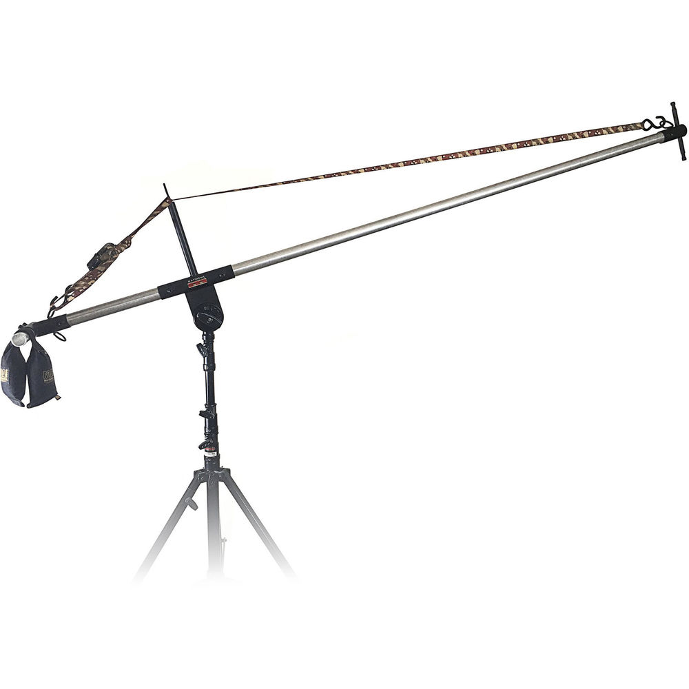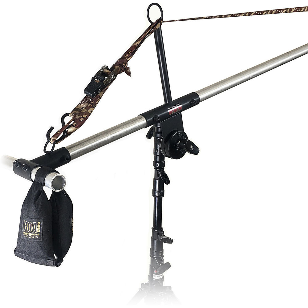 This Matthews Menace Arm Kit enables you to boom a lighting fixture attached to a 1 1/4" Schedule 40 aluminum pipe speed rail, sold separately, while keeping the light stand out of camera view. The kit includes an ear with a 9.5" anti-sag center post, dual baby pin front mount, and a rear counterweight receiver with a D-ring on top and bottom for connecting a ratchet strap to the bottom of the stand instead of a counterweight bar.