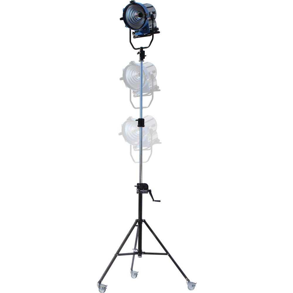 A durable, double-cable mechanism keeps both risers traveling at equal proportions with each turn of the handle, ensuring firm and steady movement of the light fixture. Thirty-eight turns of the handle will take the fixture to full height. A "Combo" dual-purpose top casting allows for use of both Junior pin and Baby receiver fixtures.