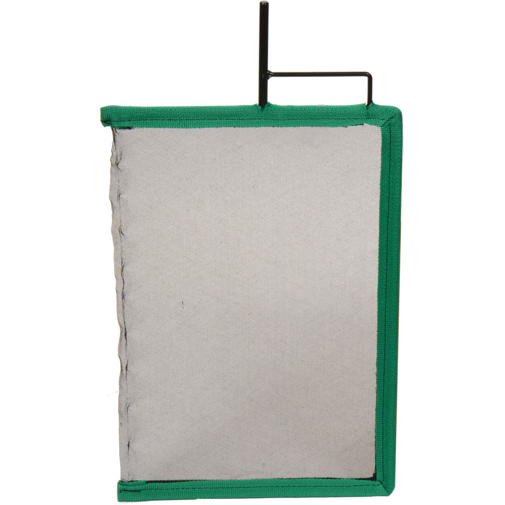 This specific frame is equipped with a single layer of Black Bobinett fabric, which reduces the effective illumination of the selected area by 1/2 stop. This is indicated by the green fabric which lines the frame. Light reduction strength can be finely tuned by rotating the scrim, thus increasing the amount of netting light needs to pass through before hitting the subject. All Matthews Open End Scrims are constructed from rigid stainless steel and sport a 3/8" pin for rigging to standard grip heads, with an integrated support that can be used to hang the scrim from a C-stand handle when not in use. A nearly invisible length of piano wire is strung across the open side of the frame in order to effectively modify light by keeping the fabric taught without casting any additional shadows.