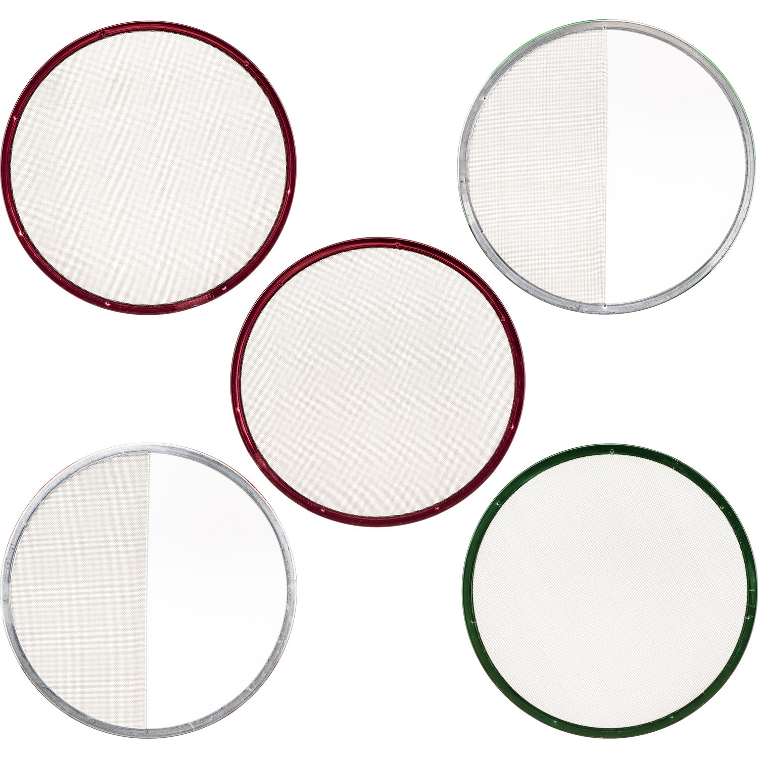 These stainless steel scrims are impervious to rust and provide durable use under uneven, intense heat from quartz and HMI lights. The circular steel rims are color-coded for rapid ease of use and repeatable set-ups.