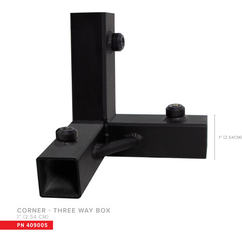 The 1.25" Three Way Box Corner from Matthews can be used when constructing boxes using 1.25" square tubing. It can be used when building an overhead softbox or when tenting a window.