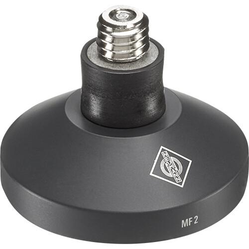 With the Neumann MF2 Microphone Table Stand at 60mm you get a small, sturdy stand with a non-slip rubber-grip base to ensure stability. There is a 1/2" threaded stud for mounting compatible microphones. The rubber shock mount between the stud and the base supresses structure-borne noise.