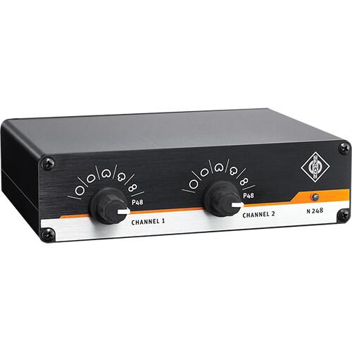 The Neumann N248 is a dual phantom power supply with dual XLR inputs and outputs. The N248 will successfully provide +48 V phantom power to a single stereo, or dual mono condenser microphones. The N248 features a 5-polar pattern remote switch that is ideal for remotely selecting the patterns found on the TLM 127 or TLM 170 microphones. Additional features include a variable phantom power rotary control.