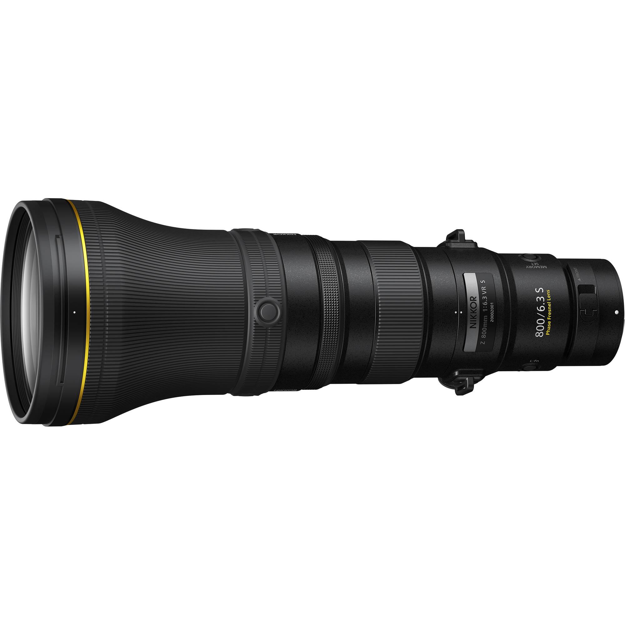 Huge focal length, compact and lightweight design. The NIKKOR Z 800mm f/6.3 VR S, from Nikon, is a super-telephoto prime distinguished by the unique combination of one of the longest focal lengths available in a surprisingly portable package. This distinct design is made possible by the inclusion of a Phase Fresnel element, which cuts the overall weight by 50% and the length by 16% compared to the former F-mount 800mm f/5.6 lens.