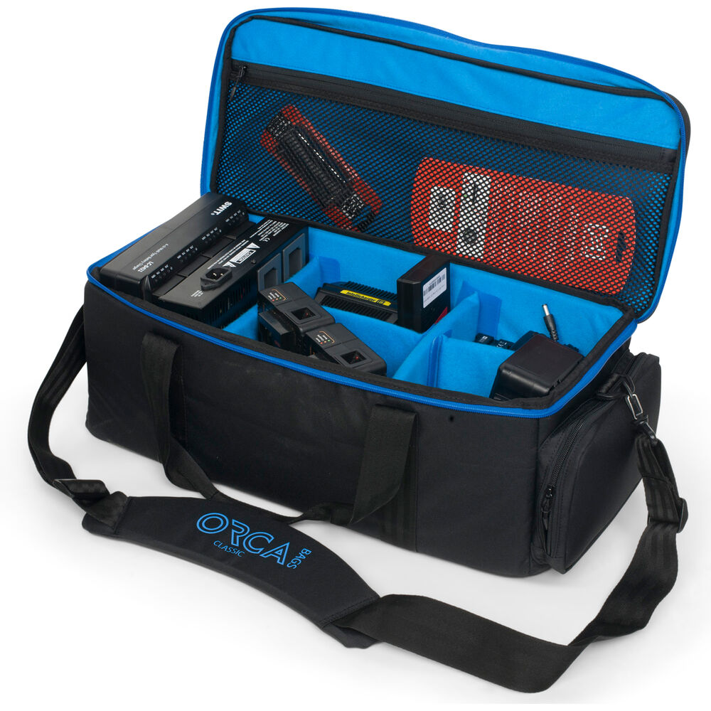 The ORCA Classic Universal Accessories Case M is designed to neatly hold camera accessories such as multiple brick batteries, a charger, a matte box, cables, and other key equipment. Five dividers allow you to organize the spacious interior to firmly hold your accessories. An interior mesh pocket fits small accessories such as media cards, and an exterior zippered pocket lets you store additional gear, including handy devices such as your smartphone.
