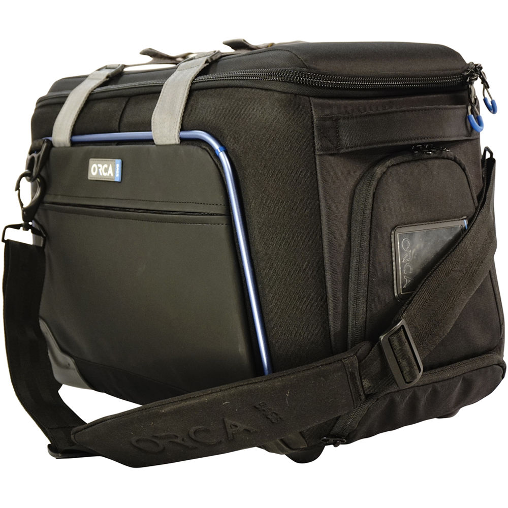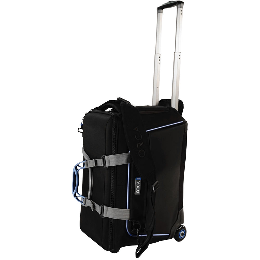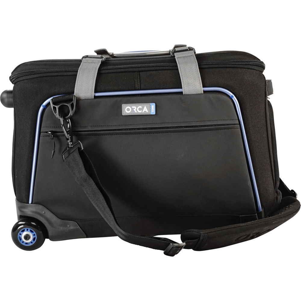 The ORCA OR-10 Video Camera Trolley Bag is designed to protect and transport a video camera up to 18.5" in length with accessories. Featuring built-in wheels and a trolley handle, the bag can be easily rolled between locations, or carried with the top handle or included padded shoulder strap. The bag is constructed using an external aluminum frame, an internal honeycomb frame, and layers of foam and EVA material to keep your gear protected. An internal divider system lets you customize the bag to suit your needs, while three external pockets provide additional storage.