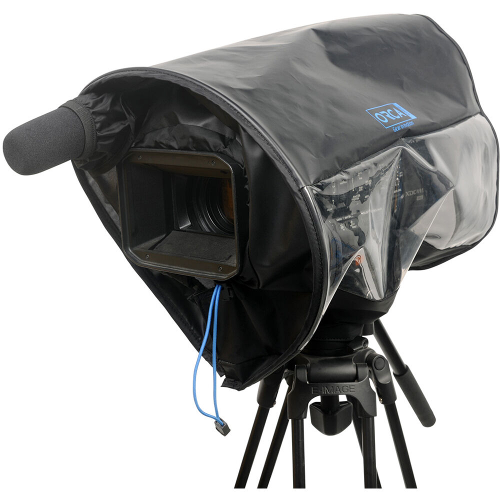 Protect your small camera in the rain or wet conditions with the 16.9" OR-103 Quick Rain Cover from ORCA. This rain cover is made from durable nylon fabric and it features transparent TPU windows so you can view your controls. It protects your small camera or camcorder measuring up to 16.9" long from rain, snow, wind, and dust during outdoor shoots. The cover slips over the camera and tightens with a bungee cord around the mic/lens. It has hook-and-loop closures on the bottom to adjust around a tripod and also provides hand openings.