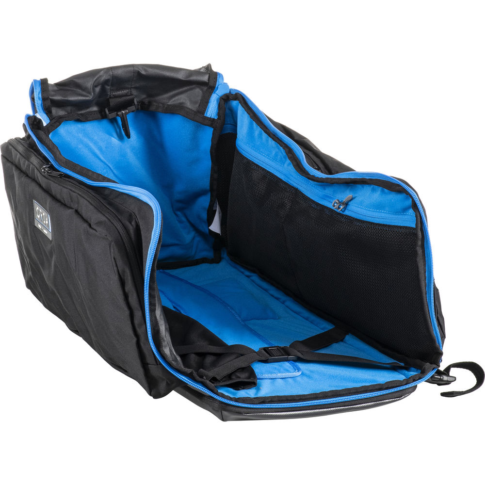 The bag comes with padded backpack straps that are stored inside a back pocket and 3 external giant pockets—one on each side and one at the top. Inside, a hook and loop system allows you to hold any Orca mixer bag. Mesh pockets for small accessories and rubber webbing enable you to secure accessories. The bag can also be used as a shoulder bag with an optional shoulder strap (sold separately).