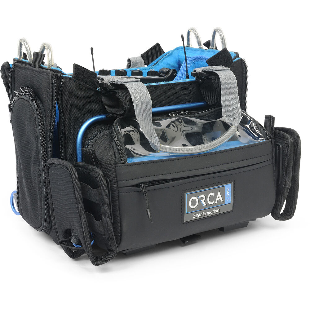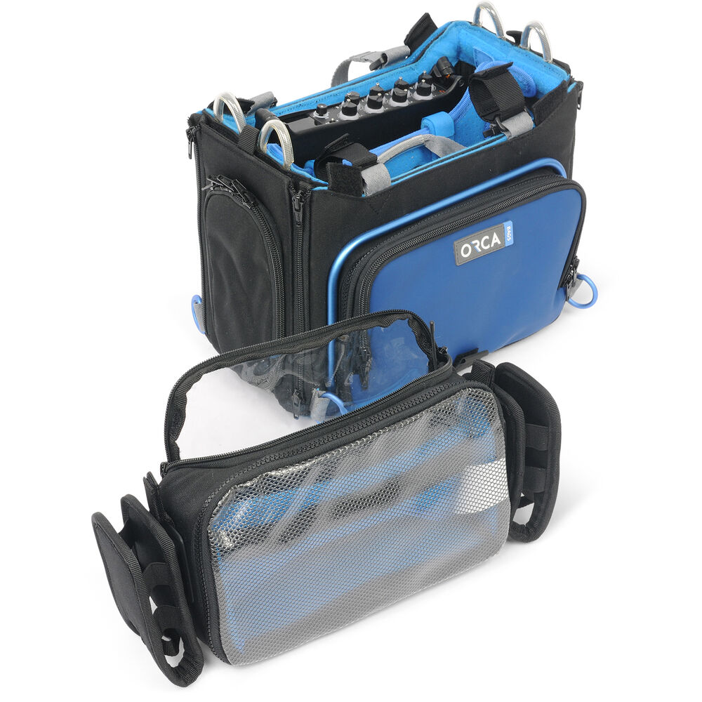 The ORCA OR-330 is an audio bag intended for the Sound Devices 833, 888, 633, the Zaxcom NOVA, or other similarly-sized field mixer. It features an internal honeycomb frame which can securely hold your recorder/mixer, and is equipped with a detachable pouch and pockets that can hold up to ten wireless receivers plus accessories.