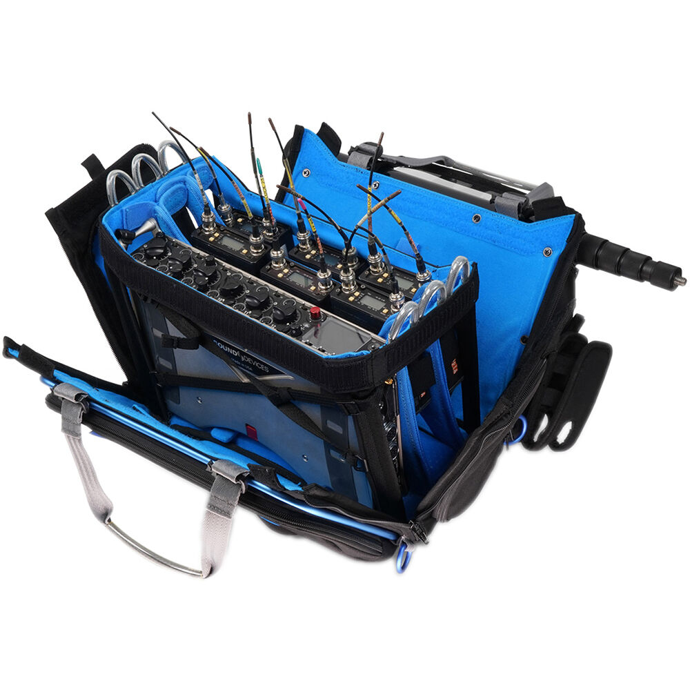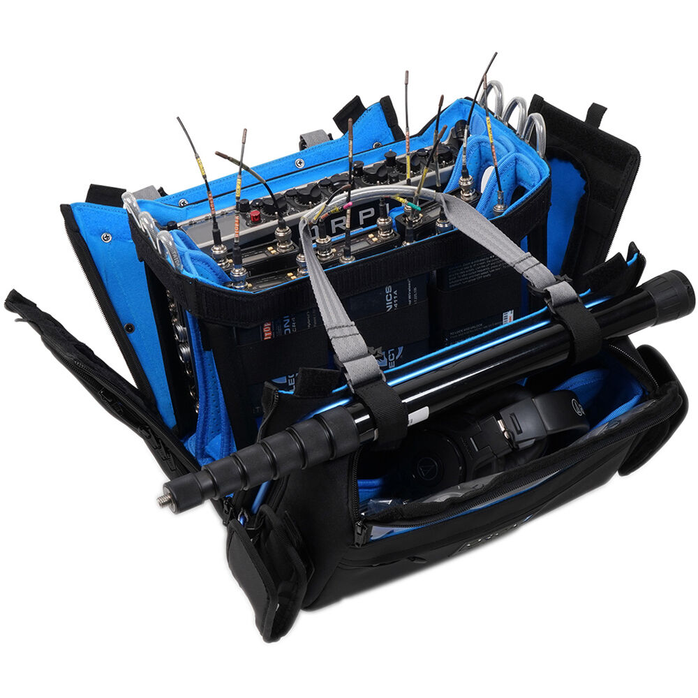The bag's angled profile offers fast and easy access to all your gear from all six sides, while the bright-blue polyester lining provides easy viewing of the equipment. A dedicated battery compartment keeps your battery safely in place and easily accessible. Two straps allow you to hold a folded boompole on top of the bag.