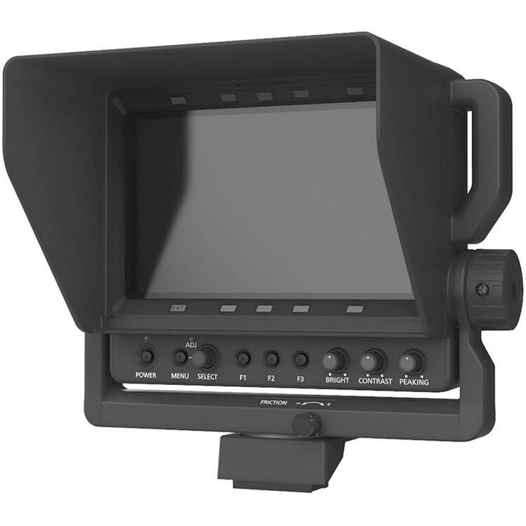 Equipped with 1280 x 800 (WXGA) resolution 7" color LCD panel. Wide horizontal/vertical viewing angle of 176°, screen brightness of 400 cd/m² and contrast of 800:1. Equipped with focus assist functions (Focus in Red, Pixel to Pixel). Direct camera menu control is possible. Equipped with three assignable function switches. Contrast, brightness, and peaking can be adjusted. Tilting (90° up, 60° down) and panning (90° left and right) is possible.