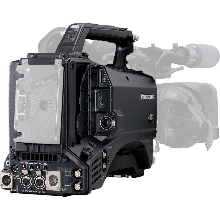 Designed for today's variable broadcasting needs, the AJ-CX4000GJ Pro 4K/HDR Streaming Camcorder from Panasonic melds UHD 4K, SRT streaming capabilities with the in-camera recording of a familiar B4 lens-mount, shoulder-supported camcorder. This 4/3" type, 11.4MP sensor video camera captures outstanding images at resolutions up to UHD 4K60 and offers nuanced, HLG (hybrid log-gamma) and Panasonic V-Log HDR recording. Video outputs include 12G-SDI, 3G-SDI, and HDMI connectors and card options consist of one expressP2 slot and two microP2/SD/SDHC/SDXC hybrid slots. Use the AJ-CX4000GJ camcorder with an optional Panasonic wireless module or a third-party USB dongle for wireless connectivity using Wi-Fi, 4G/5G, or connect it to your wired LAN network using the locking Ethernet connector. NDI|HX connectivity is available via a separate license from NewTek.