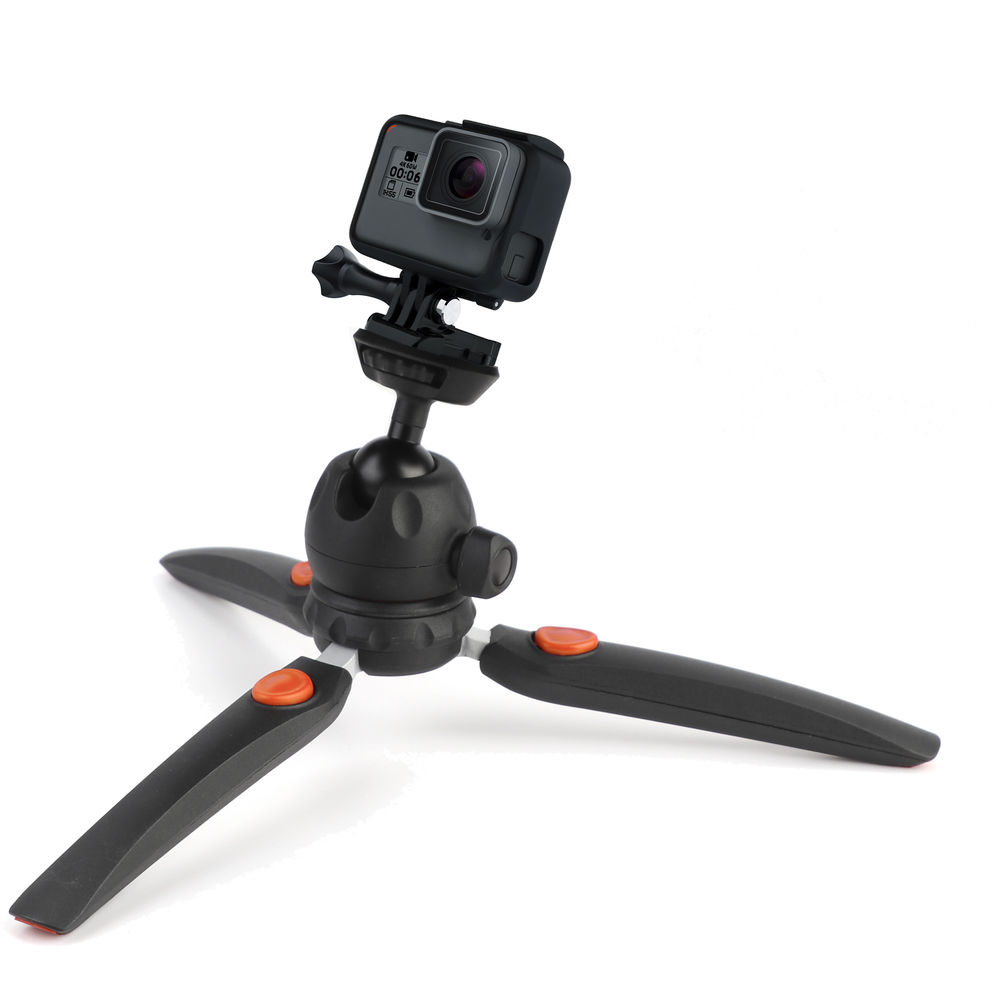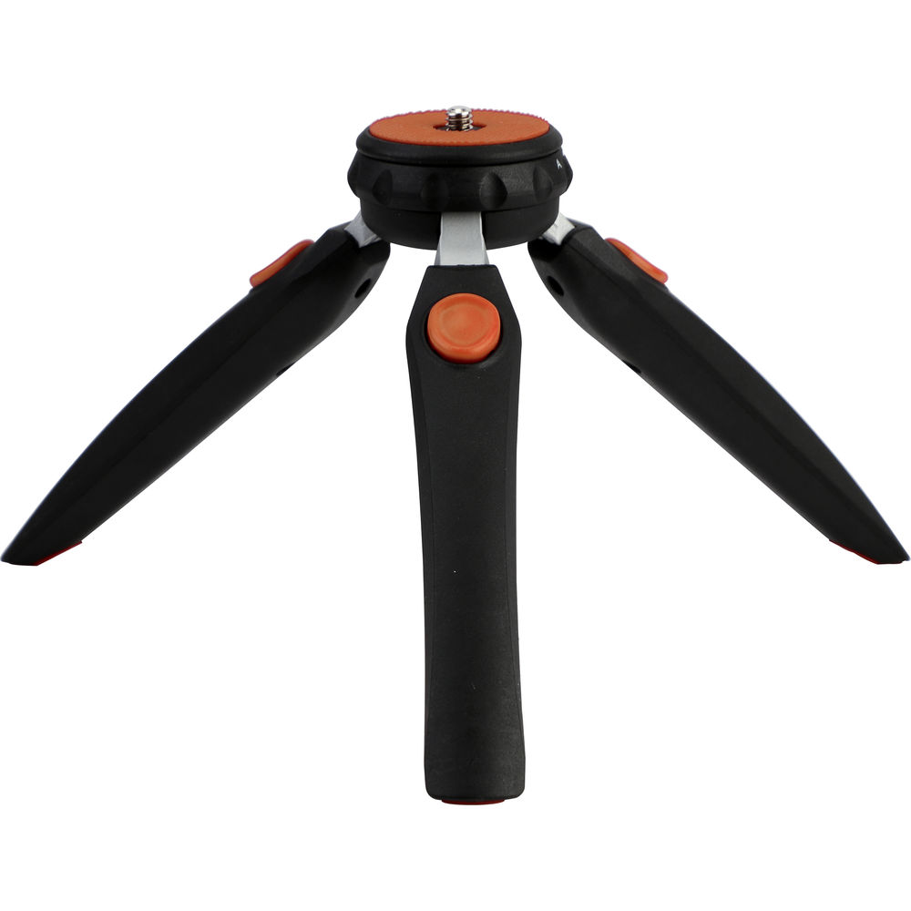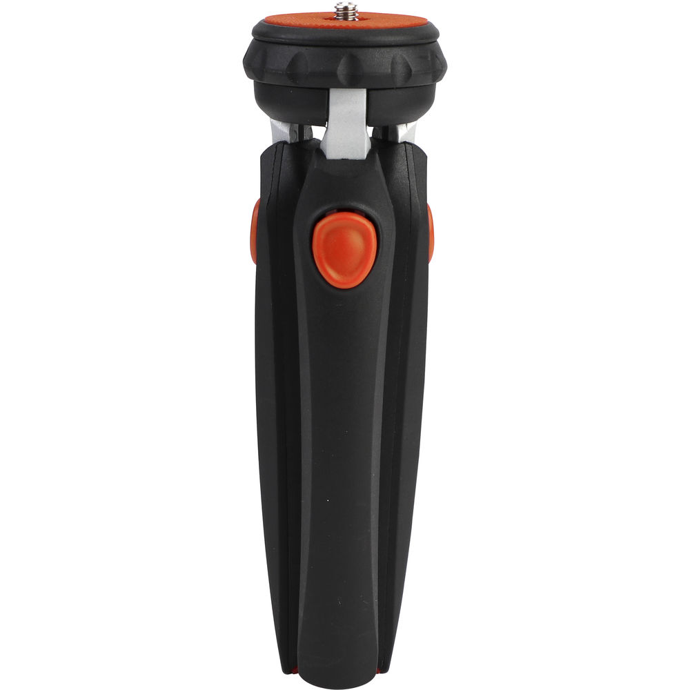 The compact and portable MT3 Mini Tripod 5-in-1 Kit from Phottix includes a mini ball head, which has a load capacity of 4.4 lb, a smart phone adapter, an action cam adapter, and a cold shoe adapter. With all the included adapters, you can accommodate a DSLR, mirrorless, or action camera, or a portable speedlight. A push button at the top of each leg controls the two angle positions. At its maximum height, the mini tripod stands at 9", and 5.1" is its minimum height. The 0.6 lb tripod's legs fold inward to a length of 9.4" for storage, but they also serve a dual purpose. With the legs folded in, they create a sturdy selfie stick to take your own portrait or video.