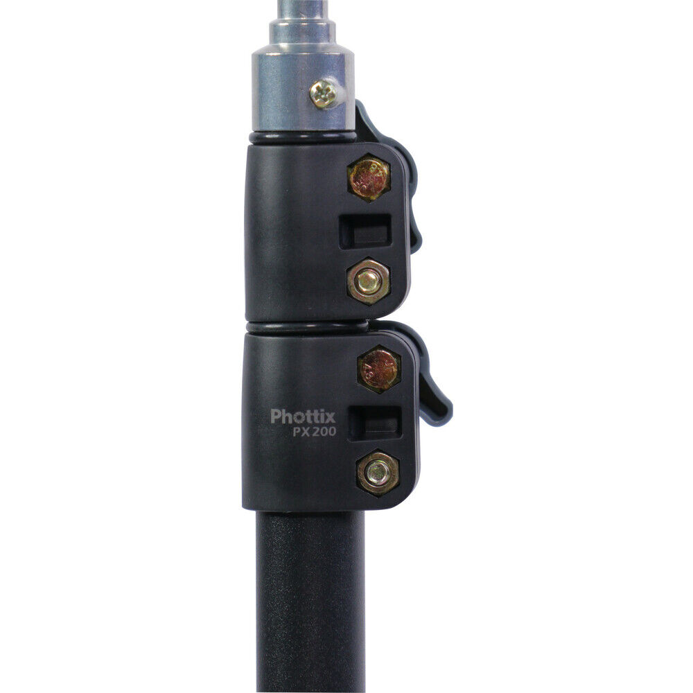 The 6.6' PX200 Light Stand from Phottix is constructed from sturdy aluminum. The 3-section PX200 stand extends to a maximum height of 6.6', folds down to 19.5", and will support gear weighing up to 3.3 lb. The 2 lb stand has spring-cushioned sections that gently lower your equipment to avert impact damage when making height adjustments.