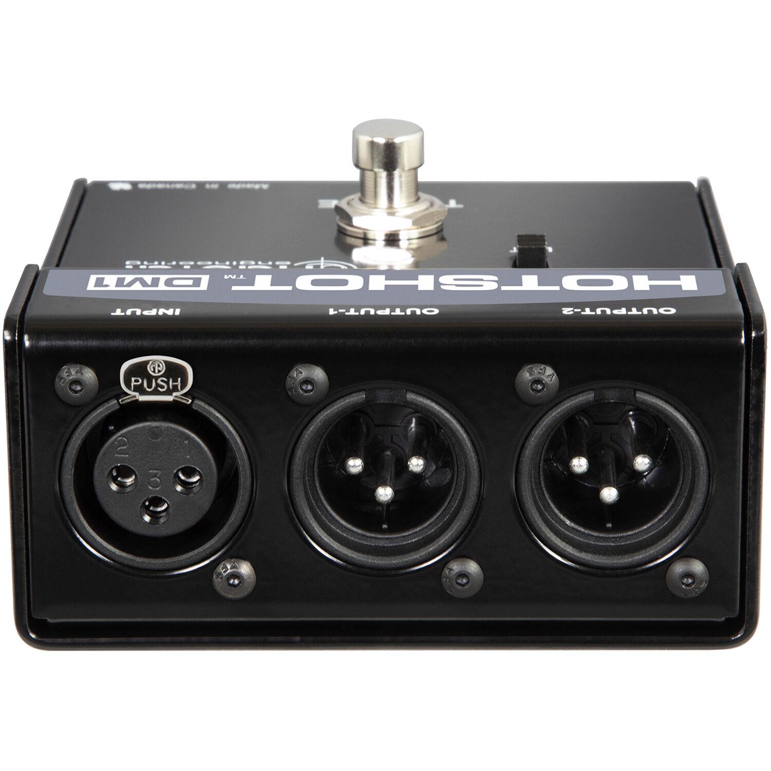 The DM1 is constructed of heavy-duty 14-gauge steel and has a number of useful applications onstage from muting a mic for coughing, to redirecting the signal for communication with stage crew or band members, to activating separate channels with unique FX chains like echo and reverb. The temporary footswitch only affects the signal while depressed, and returns normal routing upon release, while a convenient ground-lift switch can be used to eliminate pesky ground hum on the output. No matter the application, the Hotshot DM1 is an incredibly useful tool for any vocalist, stage performer, or public performance venue.