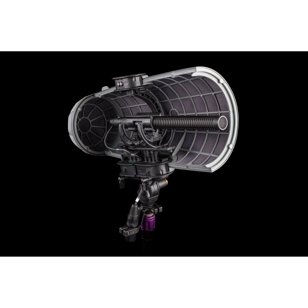 The Stereo Cyclone Windshield features an open-shell structure, curved contours, and no straight or parallel surfaces. It delivers a clean frequency response with reduced room-tone effects that characterize conventional tubular designs. Covered with 3D-Tex material and featuring an aerodynamically efficient, asymmetric shape, the basket provides wind-noise reduction comparable to the combined, modular-style, windshield-and-fur cover performance.